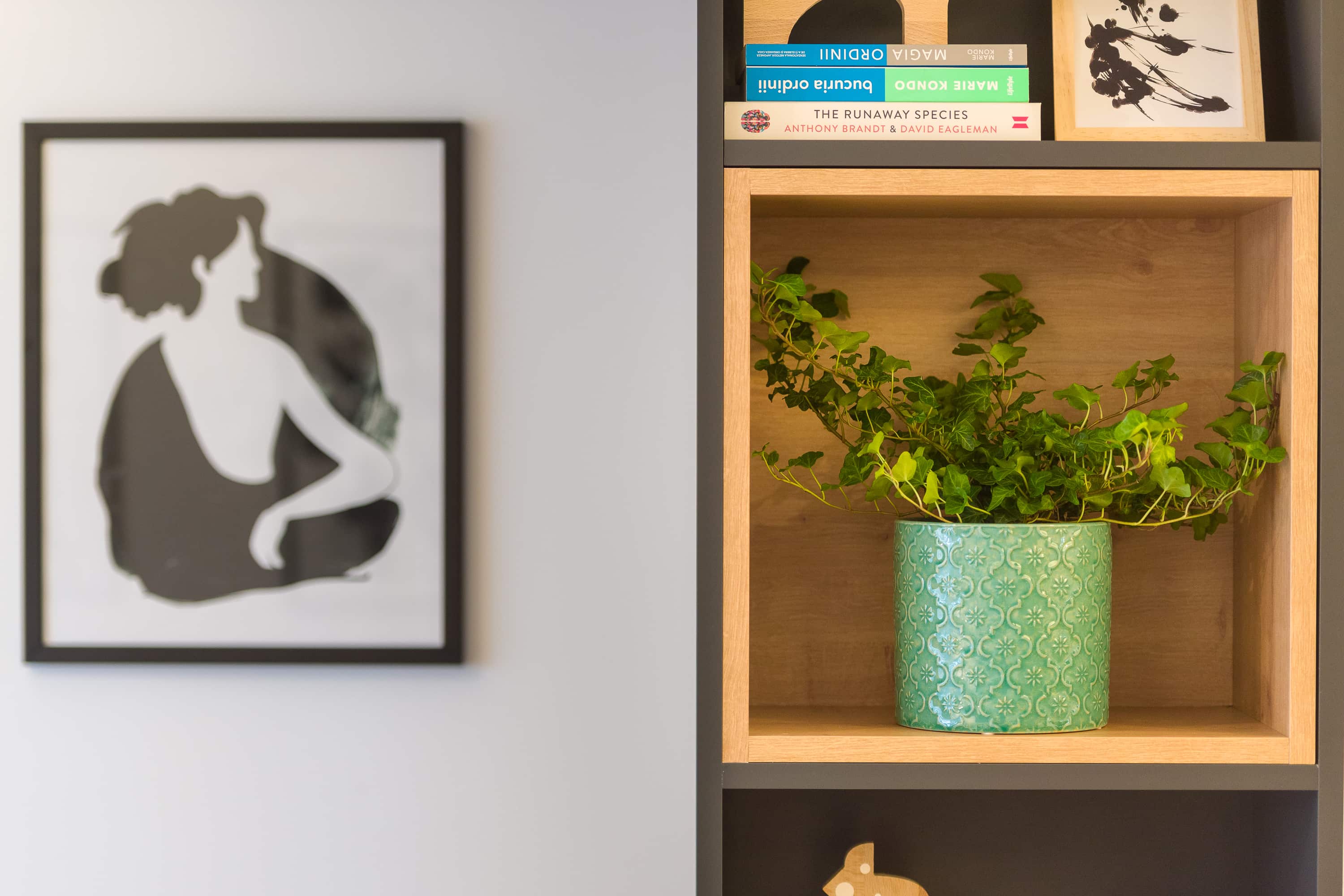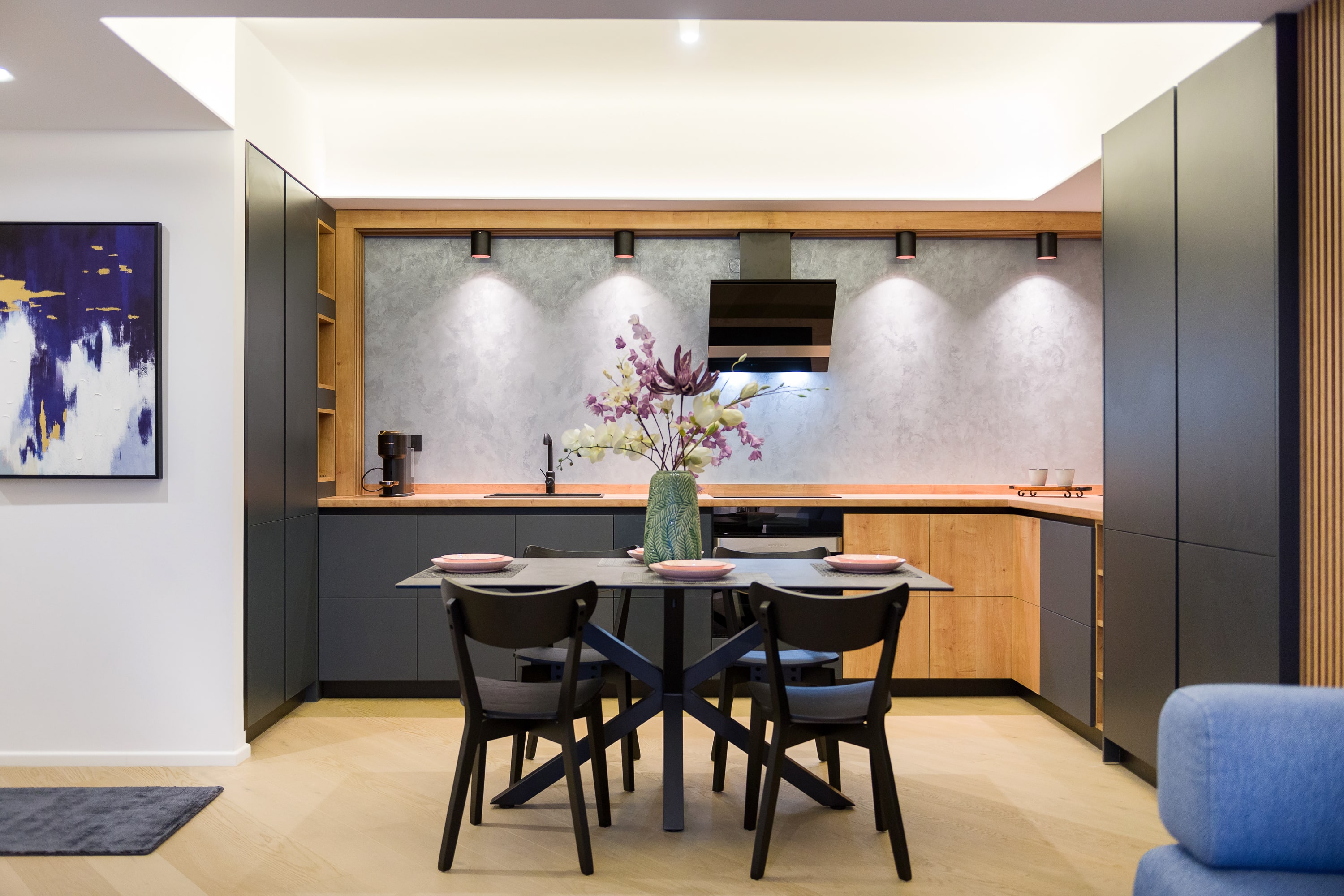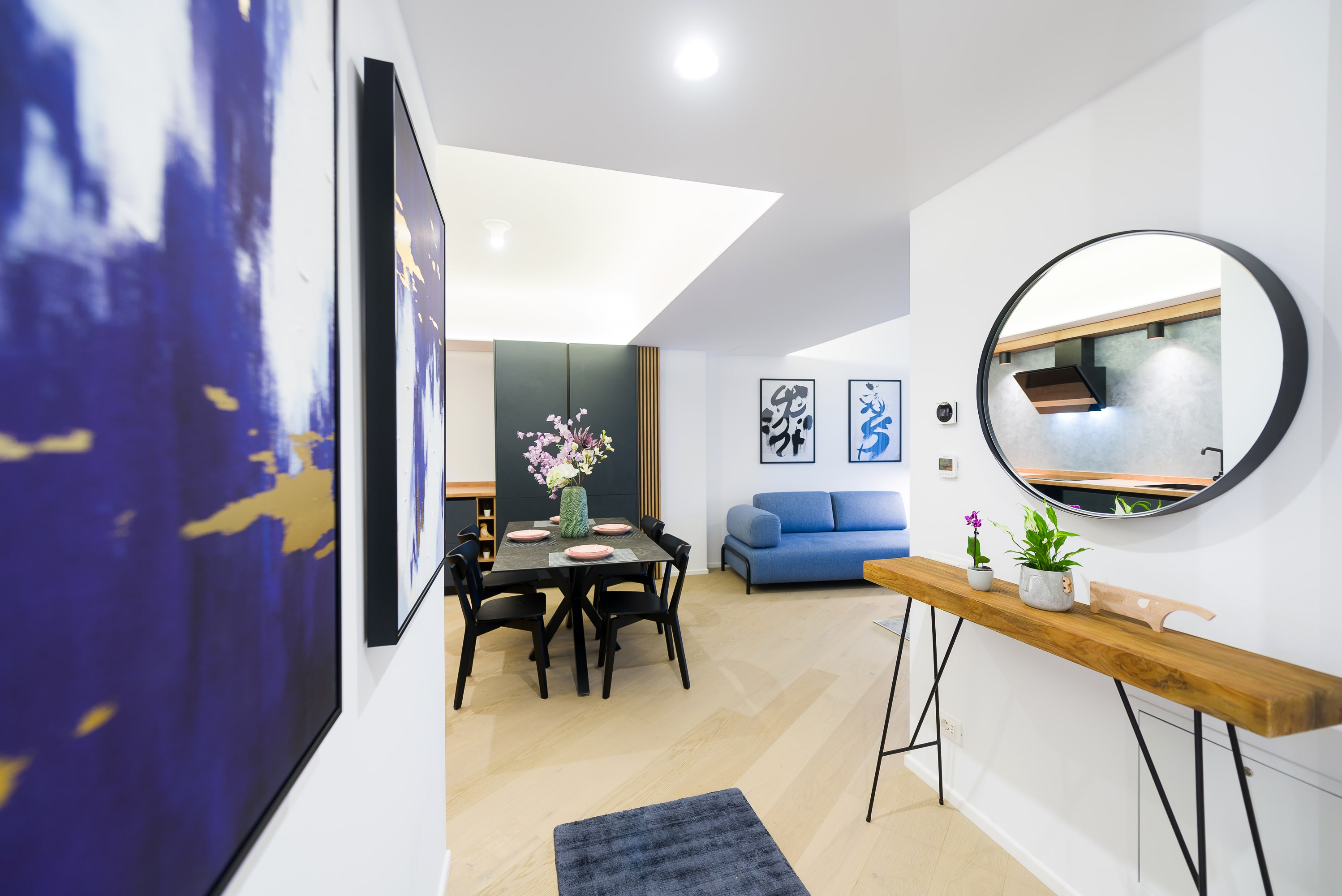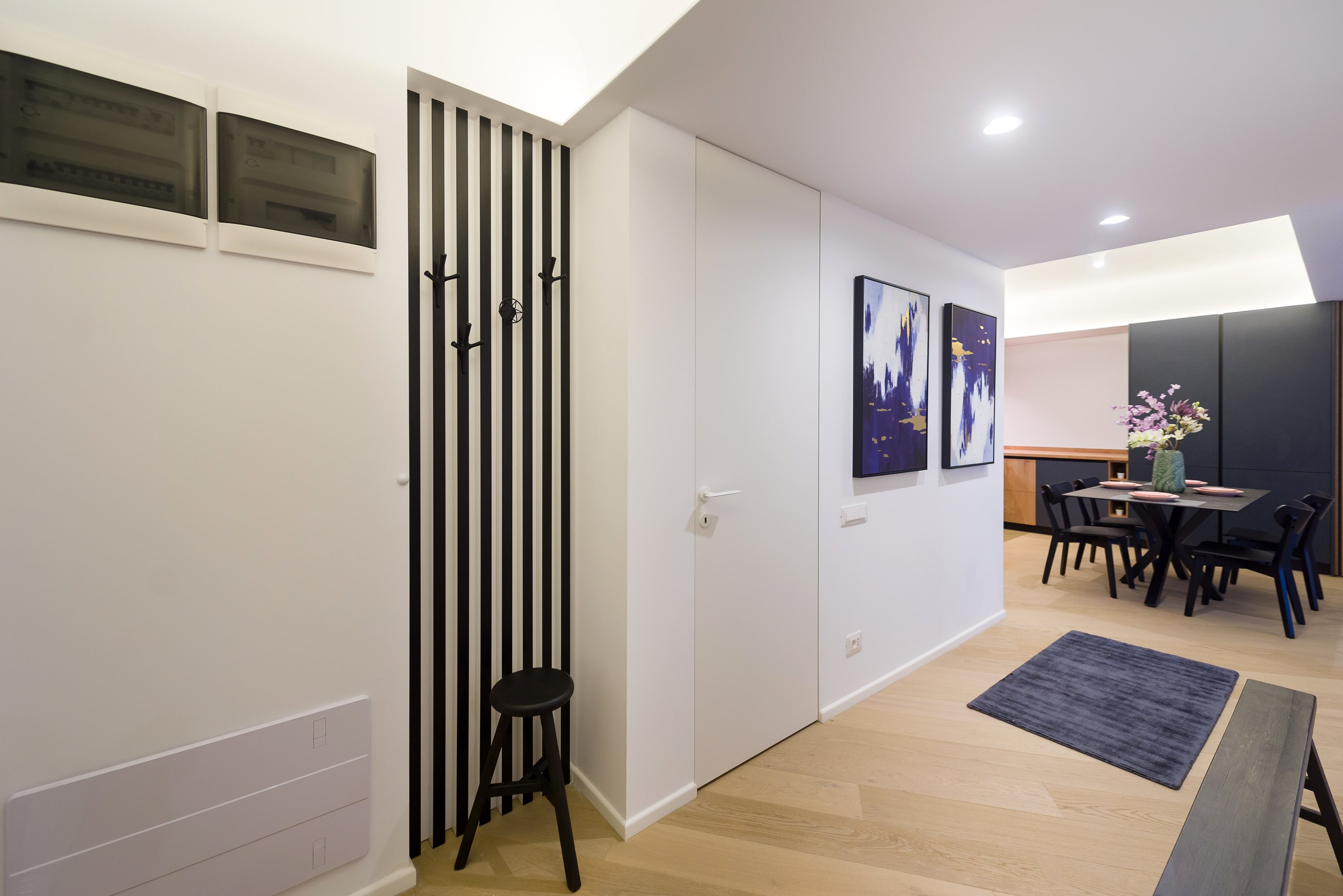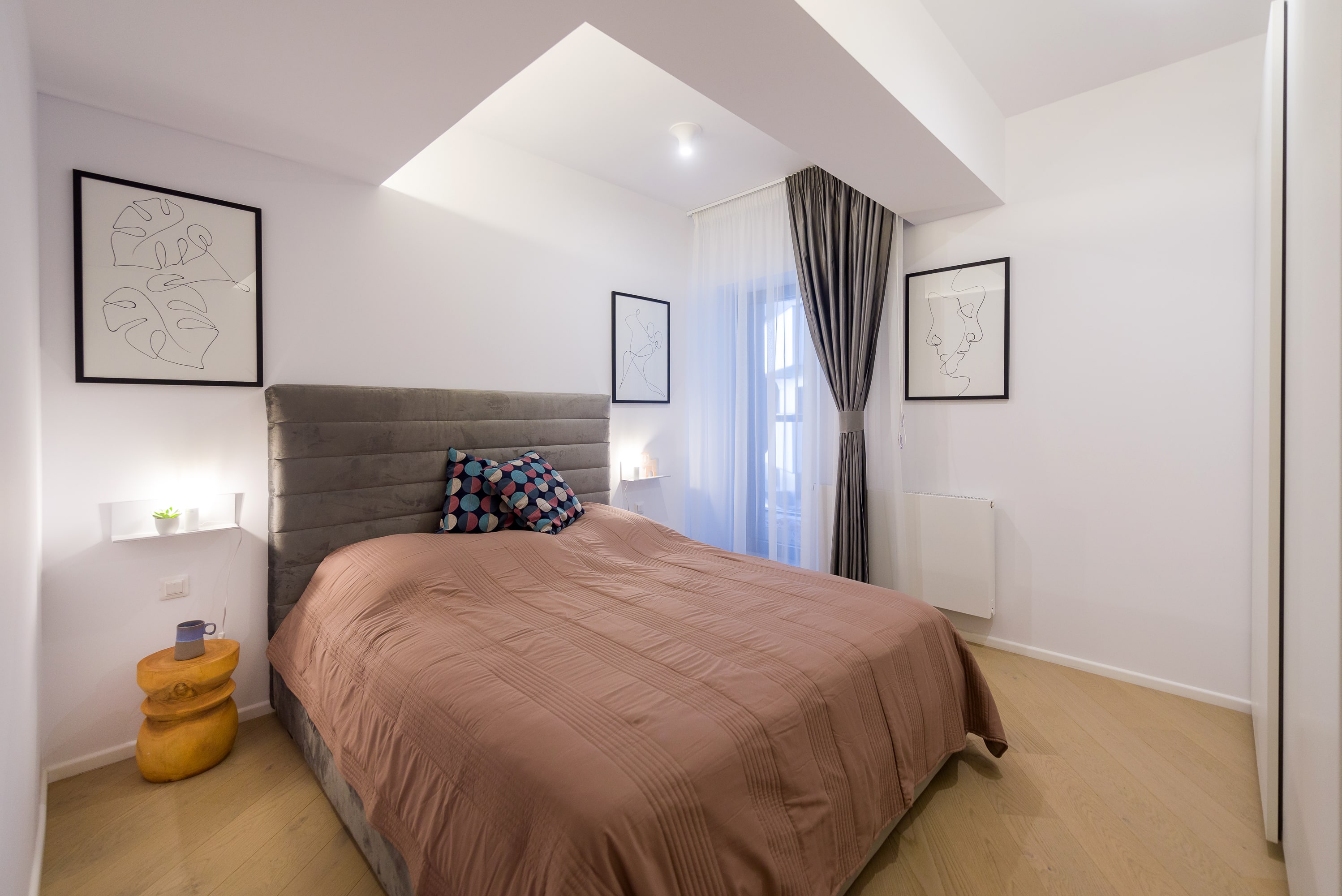 În acest apartament minimalist, fiecare element este plasat cu grijă pentru a crea un flux armonios și un spațiu care încurajează liniștea și reflecția. Iluminarea ambientală discretă adaugă o notă de eleganță și creează un cadru perfect pentru contemplare. Accentele subtile și piesele de mobilier atent alese completează armonios acest cadru, aducând autenticitate și rafinament în fiecare detaliu.